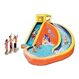 With Banzai Fall Sidewinder Falls get set to make a mega splash with this giant water slide. Leap through the tunnel and down the diving ramp into the splash pool. Then, scale the climbing wall of this 10-foot-tall waterslide and ride the banked curve all the way back into the splash pool. Inflates in less than three minutes with the included continuous-airflow blower motor and easily attaches to any hose. Heavy-duty Dura-Tech construction ensures lasting strength and durability, while the constant airflow helps resist small tears and punctures. Included blower motor features GFCI for maximum safety and convenience. It measures 15'L x 16.25'W x 10.5'H and holds up to 400 pounds.