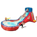 Two water blasting cannons, one at the top of the slide, the other one is on the side where you can fire away at anyone and everyone! Cool off with a blast from the top of the slide or fire away with the lower pool mounted cannon. Slide into cool fun during warm weather with the ultimate in water slides. Setup takes less than five minutes. Simply roll out the slide, attach the water bags and blower and flip the switch! The giant water slide inflates in less than 3 minutes. Connect the garden hose and watch your aqua park come to life with a cool water spray. 18 ft. L x 8 ft. 10 in. W x 9 ft 8 in H