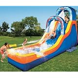 Scale the climbing wall of this huge 18 1/2 foot long water slide and go for a wet and wild ride. Slide down the two steep drops through the cascading waterfalls into the giant splash pool then blast away with one of the two built in water cannons. The double drop falls water slide inflates in less than 2 minutes with the continuous air flow blower motor and easily attaches to any hose for a powerful water spray. The heavy duty dura-tech construction insures lasting strength and durability while the constant airflow helps resist small tears and punctures. Dimensions: 9 feet 6 inch height by 18 feet 6 inch length by 4 foot 10 inch wide.