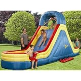 Sun Searcher Pool Water Park SlideProduct Description: Enjoy big water park action in your backyard with the Sun Searcher Water Slide!Made of puncture-resistant material, this structure will stand up to seasons of aggressive play.The anchor bags and ground stakes provide unwavering support and stability while the air fan system keeps your slide inflated for plenty of awesome sliding action.Kids use a climbing wall with handles and footholds to reach the top where integrated fountain heads water them off as they whoosh down the slide and reach the soft landing pad with an easy exit and water runoff area.We've also included long water spray tubes and a repair kit, plus a protective storage bag when it's time for a break!